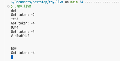 컴파일이 끝나면 ./out/my_llvm로 실행해서 표준 입력에 코드를 넣어볼 수 있다. 지금 만든 프로그램은 파일을 읽는 구조가 아니라 getchar()로 표준 입력을 직접 읽기 때문에, 터미널에 한 줄씩 입력하거나 echo "def foo(x) x + 1" | ./out/my_llvm처럼 파이프로 넘겨 확인하면 된다.